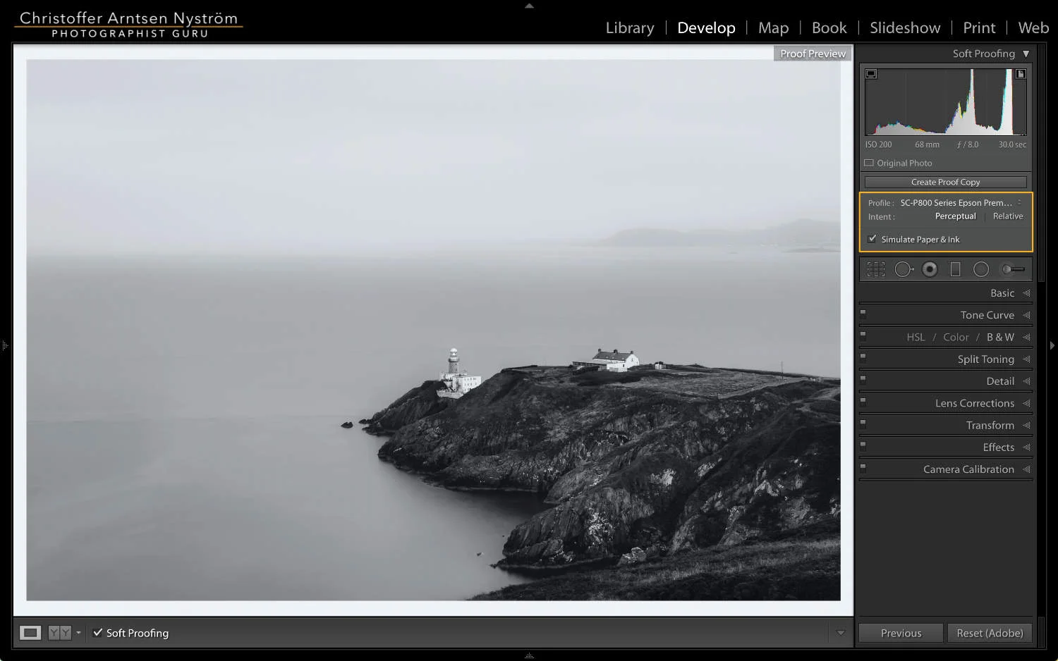 In Lightroom, soft proofing is accessed via the develop module by pressing the ’s’ key on the keyboard or by clicking the ‘Soft proofing’ tick box in the toolbar. Select the profile matching the paper you’ve chosen to print on and the rendering intent to get an approximation of how the photo will look once printed. While in soft proof mode, notice that Lightroom switches its background to white to simulate a paper and give a notification in the upper right saying, ‘Proof Preview’.